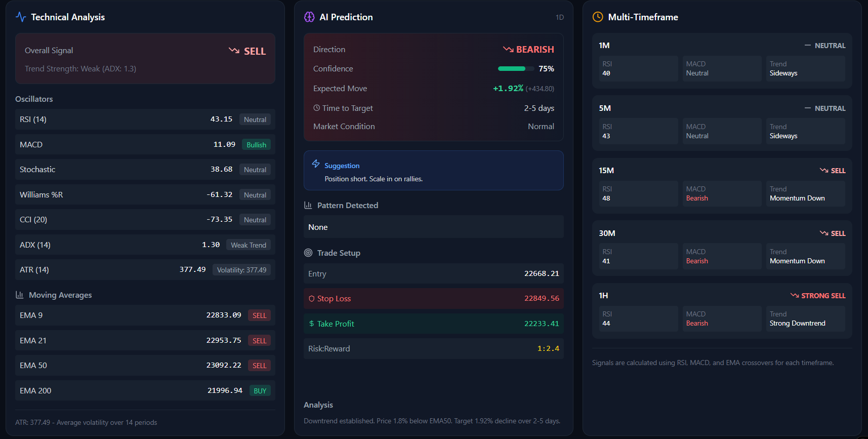 An AI-driven trading analysis tool that autonomously processes 50 years of historical market data, recognises behavioural patterns, and delivers real-time predictions with approximately 90% accuracy so traders can focus entirely on execution.